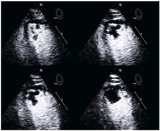 Apical sweep to evaluate the morphology of a thrombus: the frames show the irregular shape of the thrombus.