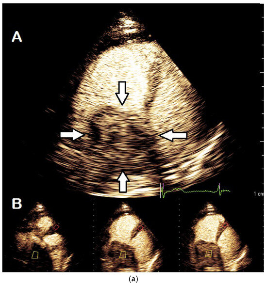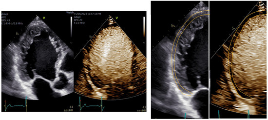 - Becher, H.; Helfen, A.; Michels, G.; Gaibazzi, N.; Senior, R.; Dietrich, C.F. How to Perform Cardiac Contrast-Enhanced Ultrasound (cCEUS): Part I. Diagnostics 2025, 15, 1743. [Google Scholar] [CrossRef] [PubMed]