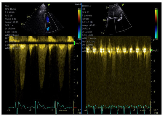 (Left) Contrast-enhanced CW Doppler recording of a patient with severe aortic valve stenosis, (right) unenhanced CW Doppler recording, Doppler envelops not closed, measurement of maximum velocity and velocity–time integral not valid.
