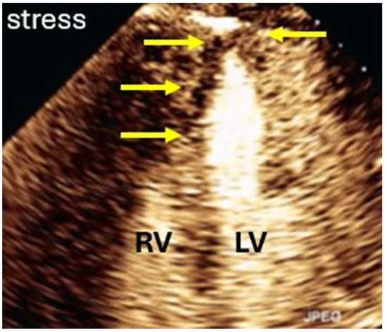 - Picano, E.; Pierard, L.; Peteiro, J.; Djordjevic-Dikic, A.; Sade, L.E.; Cortigiani, L.; Van De Heyning, C.M.; Celutkiene, J.; Gaibazzi, N.; Ciampi, Q.; et al. The clinical use of stress echocardiography in chronic coronary syndromes and beyond coronary artery disease: A clinical consensus statement from the European Association of Cardiovascular Imaging of the ESC. Eur. Heart J.—Cardiovasc. Imaging 2024, 25, e65–e90. [Google Scholar] [CrossRef]