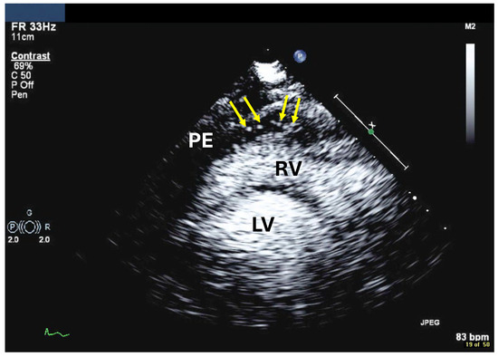 Contrast bubbles in the pericardial space (arrow) in a patient with bleeding into the pericardium, modified parasternal long-axis view, bubbles (arrows) are displayed anteriorly to the RV in the pericardial effusion (PE). NOTE: often only isolated contrast signals are displayed in the pericardial effusion. RV right ventricle, LV left ventricle.