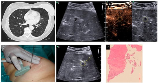 (A) CT scan showing a small pulmonary nodule adjacent to a vessel within the middle lobe. (B) Transthoracic ultrasound of the right lung under OLF revealing a smoothly marginated hypoechoic nodule adjacent to a vessel (arrow). (C) Contrast-enhanced ultrasound of the flooded lung showing a hypoechoic nodule (dashed circle) without contrast enhancement. (D) Free-hand ultrasound-guided biopsy using a T-shaped intraoperative transducer (bK medical GmbH, Quickborn, Germany). (E) Transthoracic lung ultrasound under OLF with a core biopsy needle (arrows) inserted into the nodule (dashed circle). (F) Histological image of the core biopsy showing a complete necrotic area above and vital normal lung tissue below (hematoxylin–eosin stain).