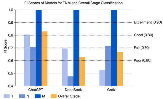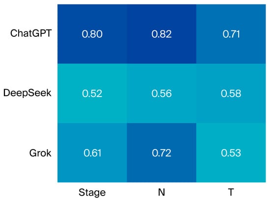 Macro-averaged F1 scores were calculated by comparing each model’s predicted T, N, M, and overall stage values with the ground truth labels on a per-patient basis. ChatGPT achieved an F1 score of 0.78 for T classification, with DeepSeek and Grok following at 0.69 and 0.64, respectively. In N classification, scores showed greater variability; ChatGPT reached 0.86, while DeepSeek and Grok recorded 0.66 and 0.78, respectively. Overall stage prediction resulted in F1 scores of 0.85 for ChatGPT, 0.65 for DeepSeek, and 0.72 for Grok. All models correctly predicted M0 in all cases, resulting in an F1 score of 1.0 for M (Figure 3, Supplementary Table S5).