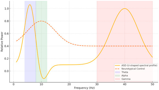 EEG is a popular non-invasive technique that measures brain activity with temporal resolution down to the millisecond. Moreover, its sensitivity to oscillatory dynamics and network-level activity make it particularly suitable for examining neurodevelopmental changes in both typical and atypical populations. Previous studies have revealed distinct EEG patterns in people with ASD—such as a “U-shaped” spectral profile with increased delta/theta and gamma power but decreased alpha activity—and in people with dyslexia—such as supranormal theta and depleted beta-1 power [8,9]. These electrophysiological patterns—their distinguishable little windows onto the brain—may be used as potential biomarkers for early detection (Figure 1).