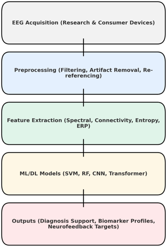 The EEG ML pipeline is described in Figure 3. Extracting features is a broad category. Spectral features were constructed by taking the absolute or relative power values across standard frequency bands of delta, theta, alpha, beta, and gamma to capture cortical activation patterns in dyslexia and ASD. Measures of connectivity varied for the study in question. In general, coherence and phase-locking value, as well as topological indices such as clustering coefficient and global efficiency, served in our attempt to characterize network integrity. Entropy-based measures were also applied. For example, sample entropy, multiscale entropy and slope entropy were employed to describe the irregularity of the signal, no longer simply measuring complexity on a paper chart. ERP features, such as amplitudes and latencies of P1, N1, and P3 components, provide task-related temporal information. In certain studies, a multimodal fusion approach was used, combining EEG features with behavioral or neuroimaging data to achieve better classification results.