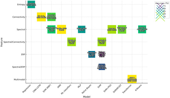 Heatmap of model performance by feature type (high-resolution version). Data adapted from Al Qazzaz et al. [13], Xu et al. [14], Fonseca et al. [15], Eroğlu [31], Eroğlu and Arman [32], Formoso et al. [33], Gallego-Molina et al. [34], Karim et al. [28], Alotaibi and Maharatna [30], Parmar and Paunwala [35], Rezvani et al. [36], Rogala et al. [37], Sait and Alkhurayyif [38], Shilaskar et al. [39], Zainuddin et al. [40].