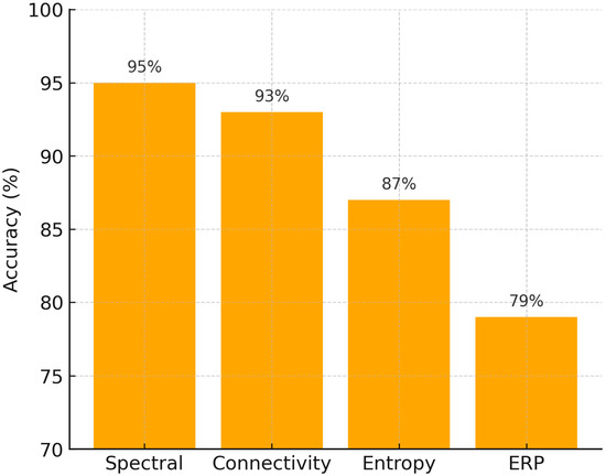 Average classification accuracy by EEG feature type. Spectral and connectivity features achieved the highest accuracy, while entropy and ERP features showed lower but complementary performance.