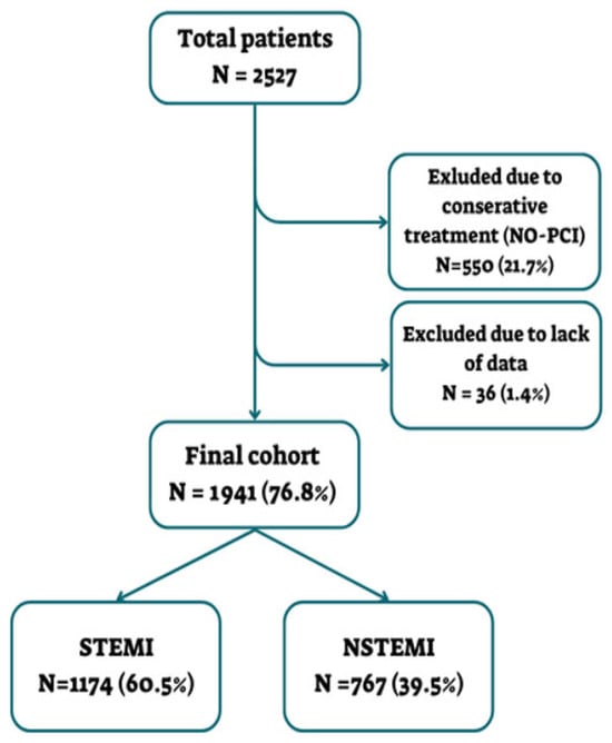 A total of 2527 patients were included during the study period. Of them, 550 (21.7%) did not undergo PCI and, hence, were excluded. Another 36 (1.4%) patients were excluded due to a lack of data. The remaining 1941 (76.8%) patients comprised the final cohort, including 1174 (60.5%) STEMI and 767 (39.5%) NSTEMI patients (Figure 1).