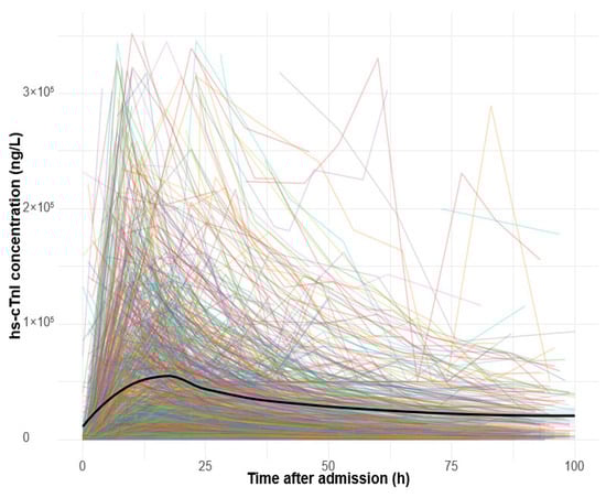 Hs-cTnI testing was conducted upon arrival at the hospital and was repeated daily, at least 3 times during admission, in accordance with national guidelines [,]. In accordance with the cardiac intensive care unit protocol at Shaare Zedek Medical Center, hs-cTnI levels were measured every 12 h in clinically stable patients and every 8 h in critically ill patients. Additional post-procedural measurements were sometimes performed at the discretion of the treating cardiologist to evaluate possible periprocedural myocardial injury. Patients were then followed up 1 year after presentation. All reported variables were taken from the index hospitalization. Hs-cTnI assays were determined in a central laboratory (using ARCHITECT STAT hs-cTnI immunoassay) with a 99th percentile reference level of 17 ng/L for females and 35 ng/L for males []). All patients who were admitted to the ICCU and had at least three hs-cTnI tests, and the highest hs-cTnI measurement was selected as the peak hs-cTnI level for the purpose of this study, regardless of measurement timing. According to the criteria outlined in the Fourth Universal Definition of Myocardial Infarction [], a second troponin peak was defined as a renewed and significant rise in troponin levels following an initial decline or plateau, exceeding the expected analytical variation. These criteria included (1) an initial sharp rise in troponin concentrations, (2) followed by a partial decline or stabilization, and (3) a subsequent distinct increase. Consistent with previous studies [] investigating the kinetics of troponin following acute MI, a second peak of hs-cTnI was defined as an increase of at least 15% in troponin concentration after an initial decline from the first peak value.