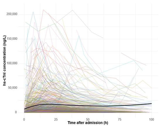 Figure 2 and Figure 3. Kinetics of hs-cTnI concentrations during the first 100 h after the initial measurement. Thin lines represent individual patients, and the bold line shows the group-level loess-smoothed trend with a 95% confidence interval. The y-axis is truncated at the 99th percentile to minimize the influence of extreme outliers.