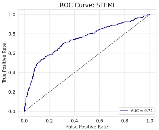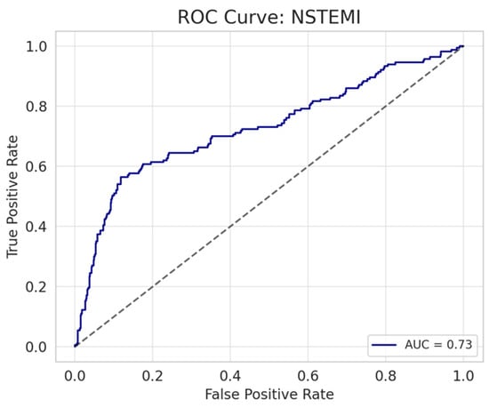 Multiple linear regression analyses were performed to identify predictors of the number of hs-cTnI peaks. The models demonstrated adjusted R2 values of 0.197 and 0.265 for STEMI and NSTEMI, respectively. In both STEMI and NSTEMI groups, the delayed troponin peak (OR = 1.019, 95% CI 1.017–1.021, B = 0.019, p < 0.001; OR = 1.008, 95% CI 1.006–1.010, B = 0.008, p < 0.001, respectively) and presence of cardiogenic shock (OR = 1.850, 95% CI 1.460–2.344, B = 0.615, p < 0.001; OR = 7.144, 95% CI 5.326–9.577, B = 1.966, p < 0.001, respectively) were consistently associated with a higher number of hs-cTnI peaks. Among NSTEMI patients, a history of ischemic heart disease (OR = 1.474, 95% CI 1.149–1.891, B = 0.388, p = 0.002) and the presence of CHF, CMP, or MVR (OR = 1.239, 95% CI 1.024–1.499, B = 0.214, p = 0.028) were also significant predictors of the number of troponin peaks. Among STEMI patients, reduced EF (OR = 0.985, 95% CI 0.977–0.993, B = −0.015, p < 0.001) and higher peak troponin levels (OR = 1.000, 95% CI 1.000–1.000, B < 0.001, p = 0.013) were also identified as predictors of an increased number of troponin peaks. The results are summarized in Table 3. Logistic regression models were constructed separately for STEMI and NSTEMI patients to identify predictors of multiple troponin peaks (defined as ≥2). For STEMI patients, the model included hours to the peak troponin level, cardiogenic shock, EF, and peak troponin level. In NSTEMI patients, predictors included cardiogenic shock, hours to the peak troponin level, ischemic heart disease, presence of CHF, CMP, or MVR, and peak troponin level. Model performance was assessed by receiver operating characteristic (ROC) curve analysis, demonstrating good discrimination with an area under the curve (AUC) of 0.74 for STEMI and 0.73 for NSTEMI. The ROC curves are illustrated in Figure 4 and Figure 5.