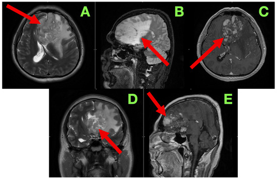 Pre-operative magnetic resonance imaging of the brain. (A): Axial T2-weighted image showing a heterogeneously hyperintense, poorly marginated intra-axial lesion (red arrow) centered in the left inferior frontal gyrus, with extension into the middle frontal gyrus and deep white matter. Marked vasogenic edema effaces cortical sulci, compresses the left lateral ventricle, and produces a midline shift of approximately 7 mm. (B): Sagittal FLAIR sequence demonstrating tumor extension into the subcallosal area (red arrow), with superior displacement and anterior bowing of the genu of the corpus callosum. Narrowing of the interhemispheric fissure and blurring of adjacent gyri indicate early subfalcine herniation. (C): Axial post-contrast T1-weighted image revealing patchy, nodular enhancement (red arrow) at the superomedial margin of the lesion, without central necrosis or ring formation. This enhancement pattern suggests partial disruption of the blood–brain barrier, typical of an infiltrative glial process. (D): Coronal T2-weighted image demonstrating inferior tumor extension into the frontoorbital cortex and anterior insula (red arrow). Associated asymmetric edema exerts mass effect on the anterior cerebral artery territory. The left frontal horn is compressed, and medial structures are displaced. (E): Sagittal post-contrast T1-weighted image showing faint, non-uniform gyriform enhancement (red arrow) along the frontobasal convexity, with blurring of the cortical–subcortical junction. No infratentorial involvement or leptomeningeal enhancement is present.
