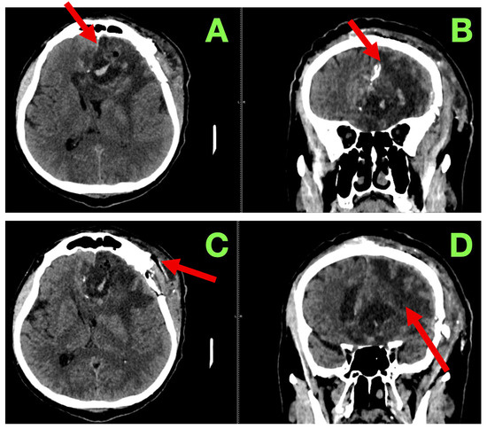 Immediate post-operative non-contrast CT scan. (A): Axial section showing a well-defined hypodense surgical cavity in the left frontobasal region (red arrow), corresponding to the zone of resection. No acute hemorrhage is present. A thin hyperdense rim along the cavity walls likely represents blood residue and oxidized cellulose (hemostatic material). (B): Coronal reconstruction demonstrating the vertical extent of the resection cavity (red arrow), which reaches the superior frontal gyrus and approaches—but does not breach—the genu of the corpus callosum. The midline remains centered, with no evidence of subfalcine or transtentorial herniation. (C): Lower axial slice illustrating the anterior margin of the resection cavity (red arrow). The basal ganglia and anterior limb of the internal capsule are preserved, and no new infarct or hematoma is detected. (D): Coronal view confirming decompression of the previously compressed left frontal horn (red arrow). No hydrocephalus or extra-axial collections are present. A subtle air–fluid level is visible within the cavity, consistent with expected early post-operative change.
