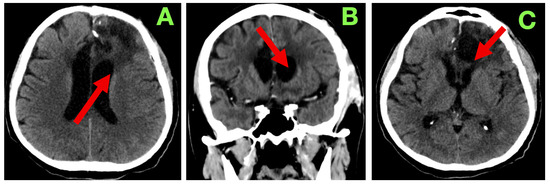 Three-month post-operative cranial CT scan. (A): Axial section demonstrating a well-defined left frontal resection cavity (red arrow) with smooth margins and no residual mass effect. Compared to the immediate post-operative stage, most of the surrounding vasogenic edema has resolved. Ventricular configuration is symmetric, with no midline shift or hydrocephalus. (B): Coronal reconstruction confirming stability of the resection cavity (red arrow), with no evidence of recurrent mass lesion. Cortical–subcortical architecture around the margins remains preserved, and no abnormal extracerebral collections are present. (C): Caudal axial slice showing the inferior aspect of the resection cavity (red arrow), with basal ganglia and thalamic anatomy intact. No delayed ischemia, hemorrhage, or secondary injury is observed, and the overall appearance is consistent with post-operative stability at three months.