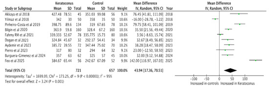 Figure 2. Forest plot of the mean difference in the subfoveal choroidal thickness between patients with keratoconus and controls [20,21,22,23,24,25,26,27,28,29].