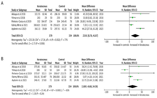Figure 3. Forest plot of the mean difference in the (A) nasal and (B) temporal choroidal thickness between patients with keratoconus and controls [20,21,22,24,26].