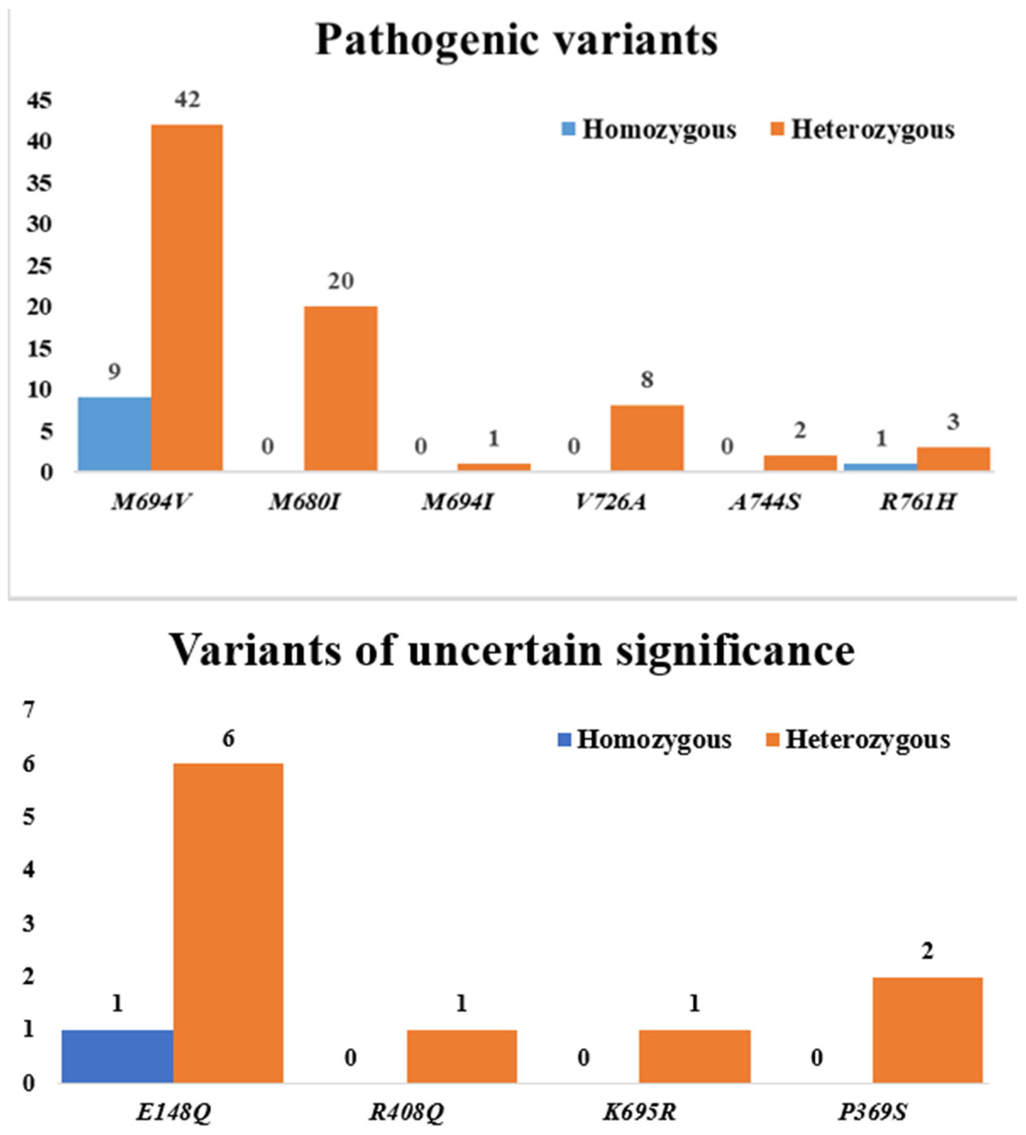 Pathogenic variants | M694V | 51 (68.9) | Homozygous n (%) | 9 (17.6) | |