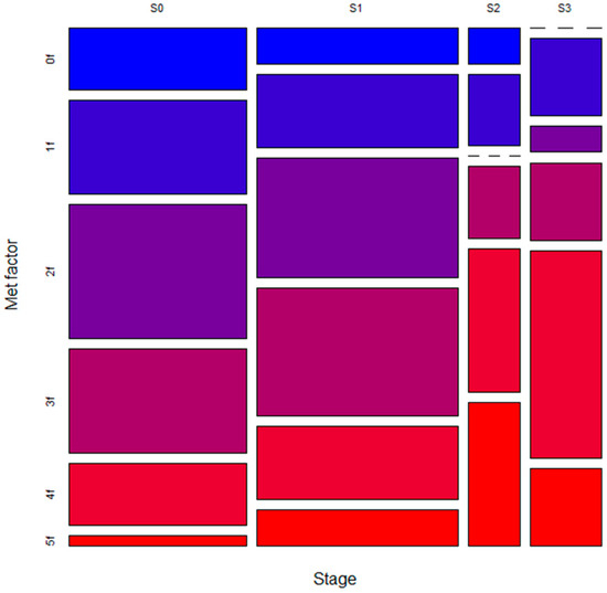 Mosaic plot displays the relationship between Metfactor (a categorical metabolic factor) and Stage (S0 to S3), which likely represents stages of liver disease progression, the severity of liver steatosis is indicated by color red.