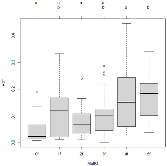 Association between hepatic steatosis and metabolic risk factors alone. This boxplot illustrates the distribution of metabolic burden (P.diff) across different levels of MetfO (Metabolic Factor Ordinal levels: 0f to 5f).