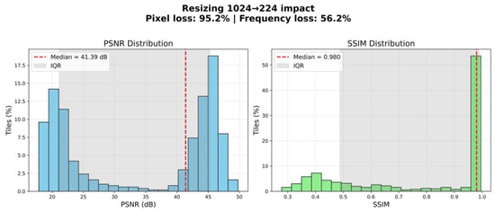 It should be noted that the scaling process preserved the key morphological characteristics of the tissues, as confirmed by visual quality control of the images following resizing. To verify that resizing did not compromise morphological integrity, we performed a quantitative evaluation of information loss. Specifically, we compared original and resized–upscaled tiles using peak signal-to-noise ratio (PSNR) and structural similarity index (SSIM). The analysis demonstrated a median PSNR of 41.39 dB (IQR: 21.14–45.24) and a median SSIM of 0.980 (IQR: 0.488–0.989). Although resizing theoretically implied a 95.2% reduction in pixel count and an estimated 56.3% loss of frequency content, the preserved structural similarity remained high (Figure 1).