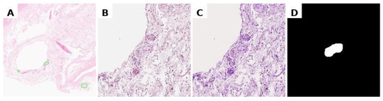 Preprocessing data for training. (A) marking of the svs file in Aperio ImageScope, (B) obtaining a histological image tile with a nerve at specified coordinates, resizing to 224 × 224 pixels; (C) normalisation of the histological image; (D) binary segmentation mask.