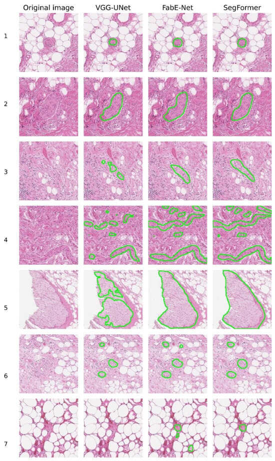 When comparing the FabE-Net and SegFormer models, it was found that the FabE-Net model is characterised by a more pronounced tendency towards segmentation errors. Among the most frequently observed errors are excessive segmentation, i.e., the selection of a wider area than the actual location of the nerve fibre (e.g., line 2), as well as false positives, where there was no nerve, but the model mistakenly classified other tissues as nerve structures. A typical example is line 7, where FabE-Net recognised macrophages and adipose tissue as nerve tissue.