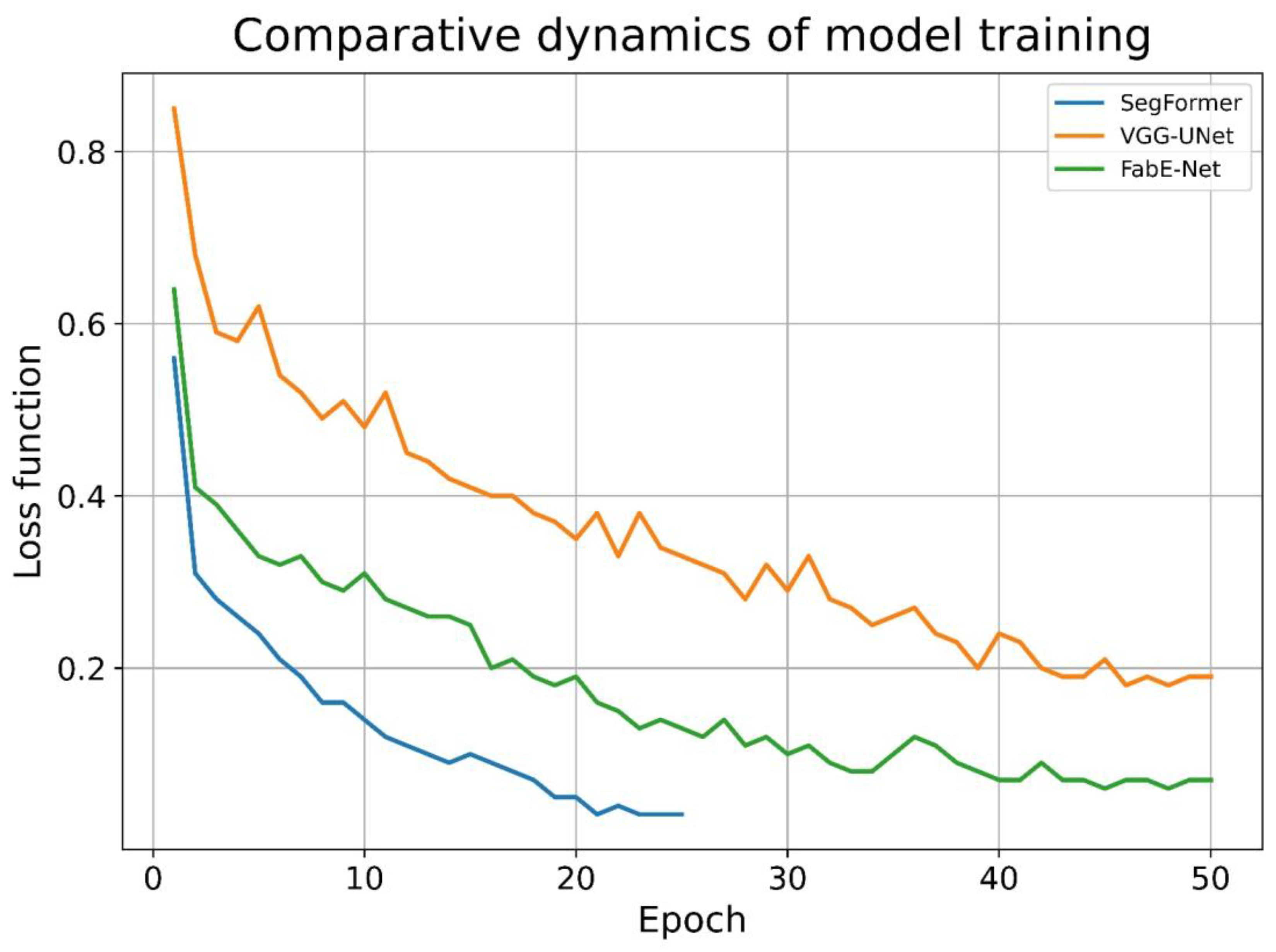 During model training, the convergence rate of gradient descent varied across architectures. For the SegFormer model, stable convergence was achieved between the 20th and 30th epochs, whereas the VGG-UNet and FabE-Net models required substantially more iterations, approximately 45 to 60 epochs. Notably, the SegFormer model exhibited the fastest loss function decay, while the VGG-UNet model demonstrated the slowest (