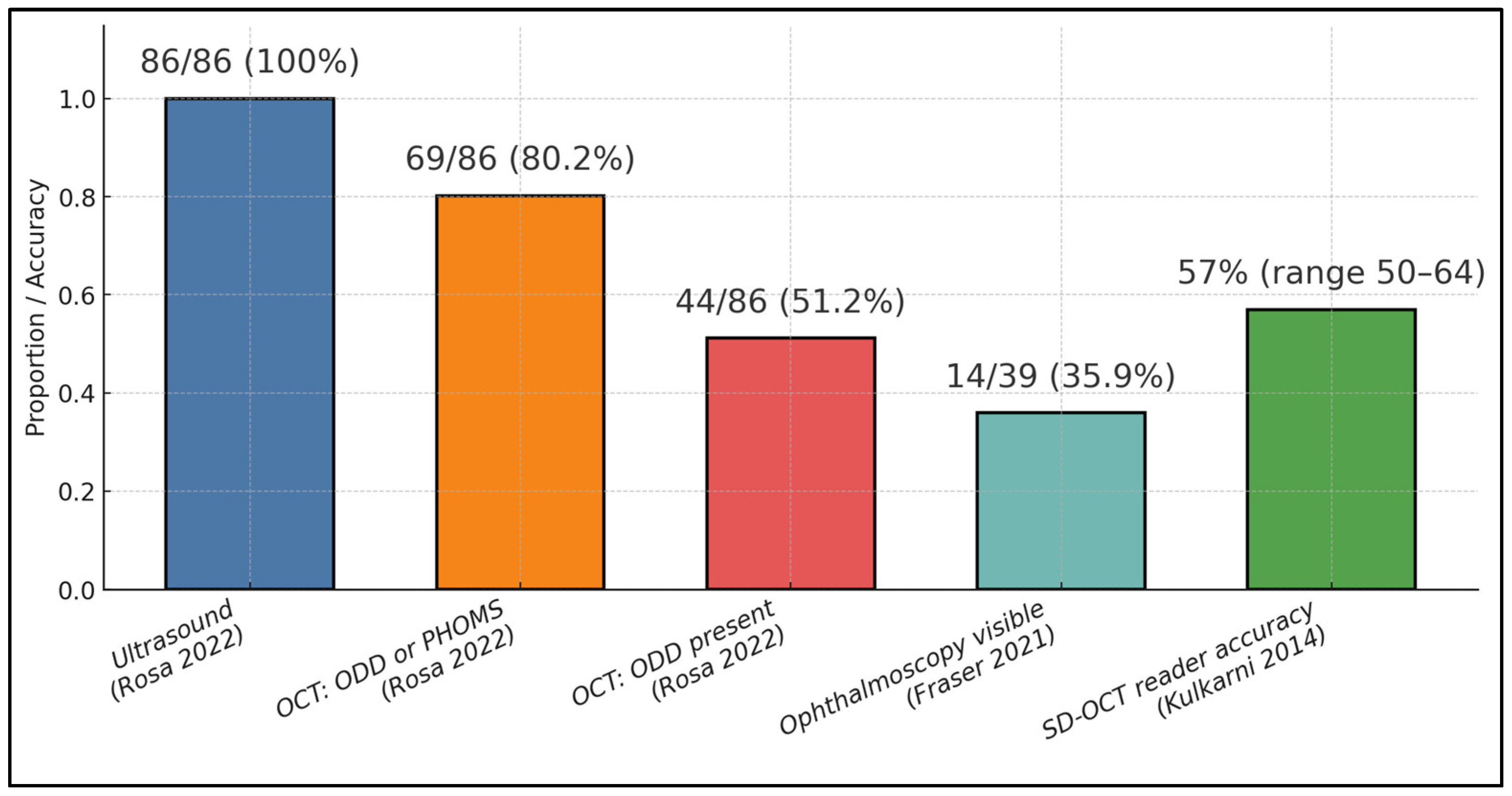 Rosa 2022 [25] | ODD detection by modality in eyes with ODD (n = 86) | Ultrasound: 87.2%; OCT: 80.2%; FAF: 62.8% | Ultrasound has the highest single-test yield; OCT is close; FAF lags | 86 ODD eyes (50 patients) + 54 papilledema eyes | ODD group US-positive; SD-OCT performed on ODD eyes. |