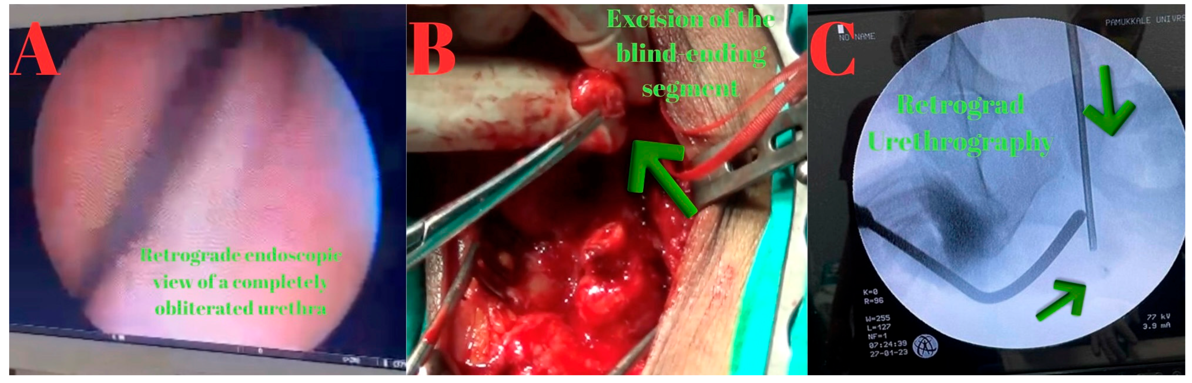 (A): Retrograde endoscopic image showing complete urethral obstruction. (B): Intraoperative photograph demonstrating excision of the blind-ending urethral segment (green arrow). (C): Combined antegrade (orange arrow) and retrograde (blue arrow) urethrography images, illustrating the non-communicating gap between the two ends of the urethra.