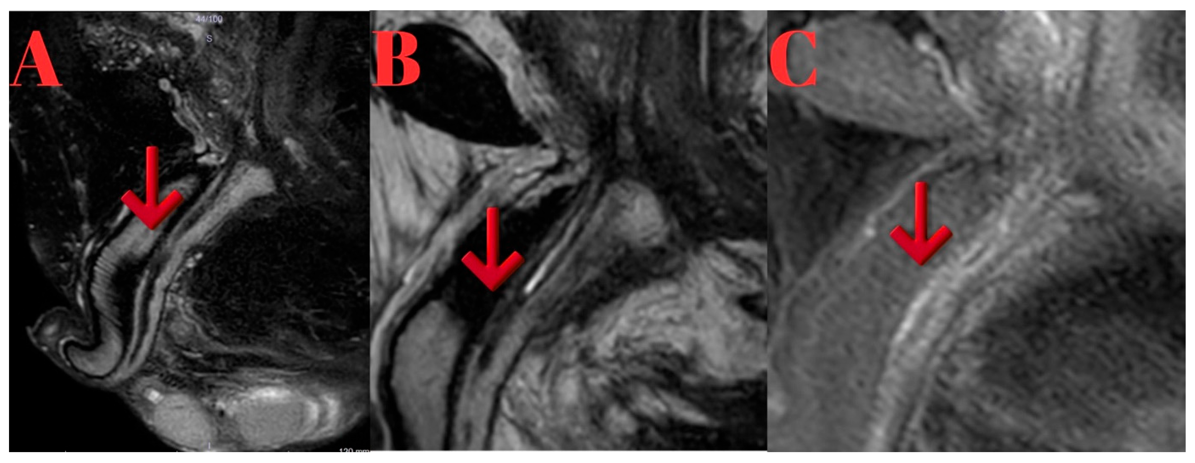 (A,B): T2-weighted sagittal images demonstrating complete obliteration at the distal bulbar urethra (arrows). (C): Post-contrast fat-suppressed T1-weighted sagittal image showing a narrowed lumen with surrounding inflammatory and fibrotic changes (arrow).
