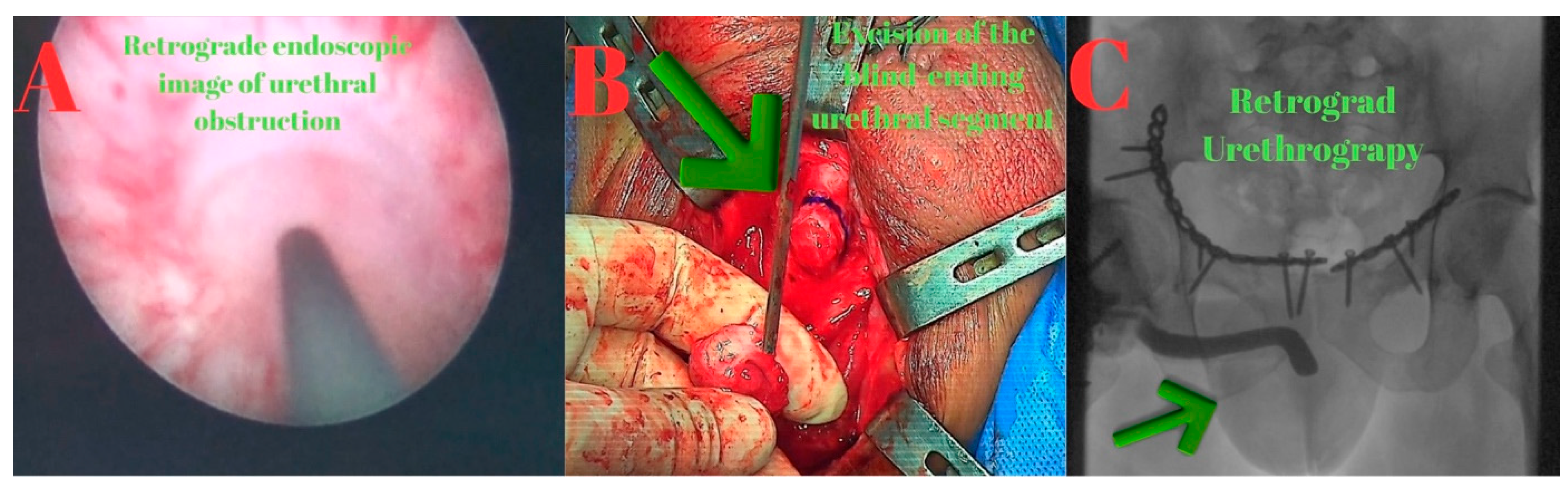 (A): Retrograde endoscopic image demonstrating complete urethral obstruction. (B): Intraoperative photograph showing excision of the blind-ending obliterated segment during urethroplasty (arrow). (C): Retrograde urethrography image, highlighting the obliterated segment in the anterior urethra (arrow).