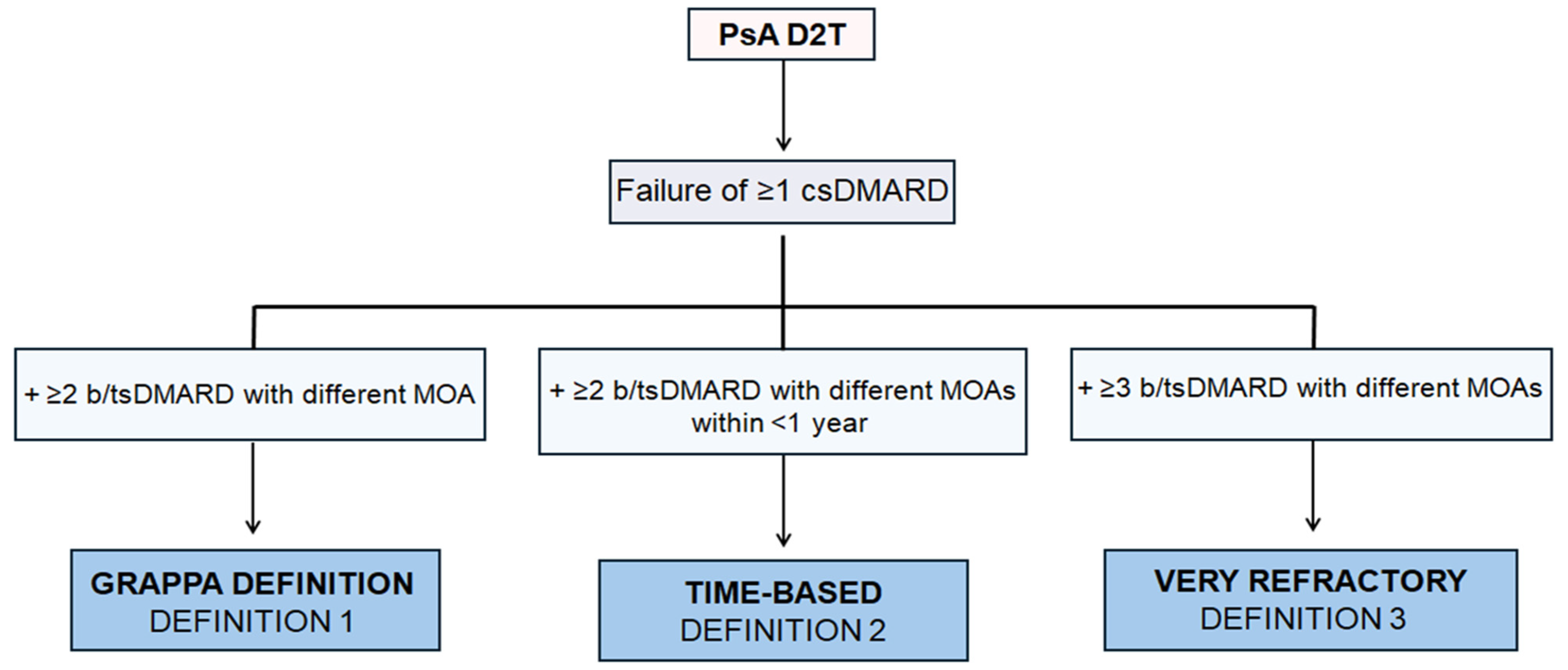 - Failure of ≥1 csDMARD and ≥2 bDMARD or tsDMARD with different mechanism of action (MOA) (GRAPPA definition).
