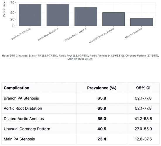 Branch PA stenosis was detected by CT in 31 patients (65.9%), representing the most common post-ASO complication, with bilateral stenosis in 12 cases (25.5%) and unilateral stenosis in 19 cases (40.4%). Quantitative measurements revealed significant PA undersizing, with median Z-scores substantially below normal: main PA −1.62, RPA −1.29, and LPA −1.79. Novel geometric measurements showed abnormal PA bending patterns (RPA: 98.45° ± 19.82°, LPA: 92.45° ± 16.89°). Main pulmonary artery, right and left pulmonary artery stenosis are shown in Figure 1. Aortic root dilatation was prevalent, with dilated aortic annulus in 26 patients (55.3%), dilated aortic root in 31 patients (65.9%), and dilated sinotubular junction in 22 patients (46.8%). Median Z-scores significantly exceeded normal values: aortic annulus 2.95, sinus of Valsalva 2.56, and sinotubular junction 2.47. Normal coronary anatomy was present in 28 patients (59.5%), with unusual coronary patterns in 19 patients (40.5%). MAPCAs were detected in 6 patients (12.7%). Dilated aortic root and coronary abnormalities are shown in Figure 2. CT angiography findings are presented in Table 2. The prevalence of major post-ASO complications is illustrated in Figure 3.