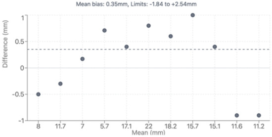Bland–Altman plot showing agreement between CTA and TTE. CTA: computed tomography, TTE: transthoracic echocardiography.