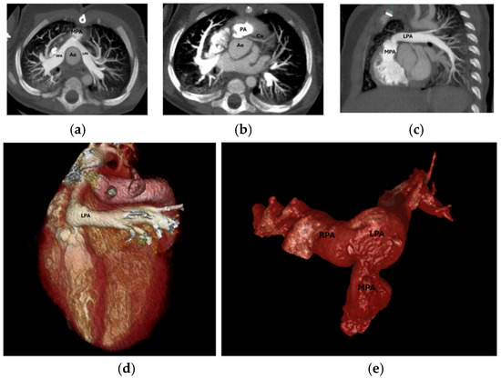 (a) Axial MPA stenosis, (b) Axial coronary artery origin, (c): Sagittal LPA stenosis, (d) 3D LPA stenosis, (e) 3D PA and branches. MPA: Main Pulmonary Artery, LPA: Left Pulmonary Artery, PA: Pulmonary Artery, 3D: Three-dimensional, Ao: Aorta, RPA: Right Pulmonary Artery, Ca: Coronary artery.
