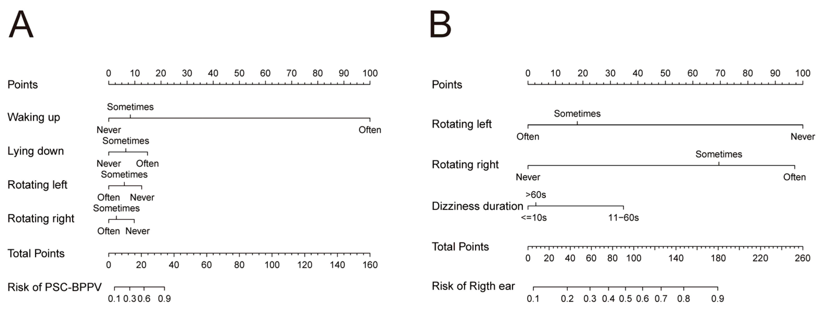 Chicago/Turabian StyleWang, Linlin, Kaijun Xia, Yangming Leng, Renhong Zhou, Jingjing Liu, Hongchang Wang, Hongjun Xiao, and Bo Liu. 2025. "A Questionnaire-Derived Prediction Nomogram for Affected Semicircular Canal and Laterality of Benign Paroxysmal Positional Vertigo" Diagnostics 15, no. 19: 2435. https://doi.org/10.3390/diagnostics15192435