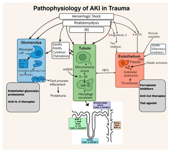 Pathophysiology of trauma-induced acute kidney injury: crosstalk among glomerular, tubular, and endothelial compartments. MCP-1, and TNF-α. Within the tubule (green), mitochondrial stress and release of mitochondrial DNA activate IL-34 and HIF-1α, recruiting macrophages; this involves the proximal tubule (S1, S2, S3) (KIM-1, L-FABP, NAG, IL-18, TIMP-2·IGFBP7), loop of Henle (NGAL, TIMP-2·IGFBP7), distal tubule (Myoglobin, NGAL, TIMP-2·IGFBP7), and collecting tubule (NGAL, NAG, KIM-1). Within the endothelium (red), reduced nitric oxide (NO) bioavailability, Tie2 inhibition, and platelet activation promote endothelial dysfunction and microvascular thrombosis. Inter-compartmental signals (arrows) include neutrophil extracellular traps (NETs) and angiotensin II-mediated pericyte activation, amplifying injury. The grey panels indicate emerging therapeutic strategies: endothelial glycocalyx protectants, anti-IL-6 agents, ferroptosis inhibitors, and Tie2 agonists. Abbreviations: eNOS, endothelial nitric oxide synthase; mtDNA, mitochondrial DNA.
