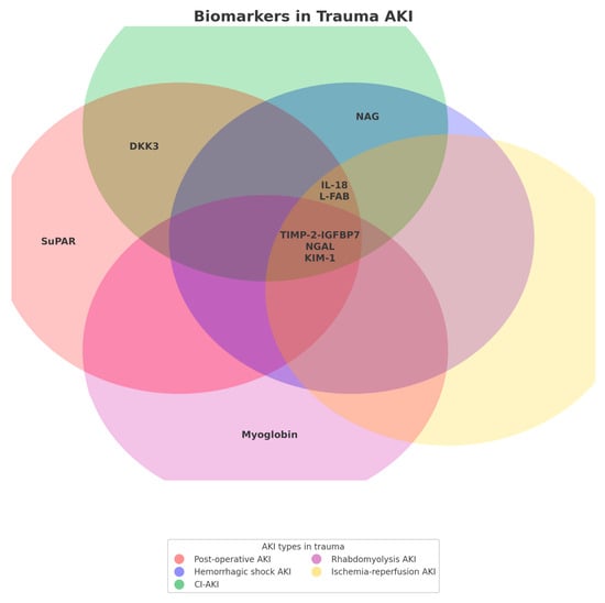 - Frelich, M.; Vodička, V.; Jor, O.; Burša, F.; Sklienka, P. Predicting Acute Kidney Injury in Trauma Patients: Biomarkers as Early Indicators. Med. Sci. Monit. 2024, 30, e942271. [Google Scholar] [CrossRef]