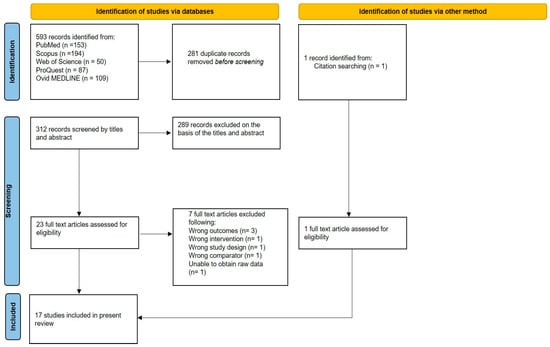 A total of 593 potentially relevant studies were identified through the systematic literature search. After the removal of 281 duplicates, 312 studies were screened by title and abstract. Of these, 289 were excluded based on predefined eligibility criteria. The remaining 23 full-text articles were assessed for inclusion, with one additional study identified through citation searching. Following full-text review, 7 studies were excluded, resulting in the inclusion of 17 trials in the final analysis. The study selection process is detailed in Figure 1.