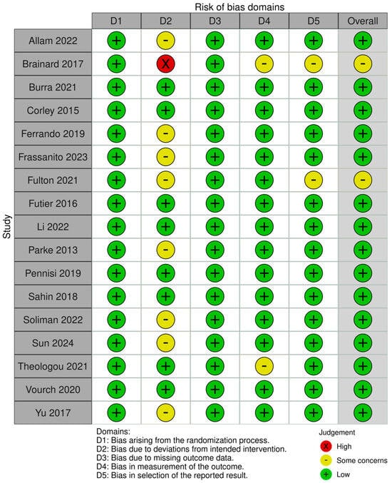 The methodological quality of the included RCTs was assessed using the Cochrane Risk of Bias 2.0 tool, focusing on five domains, and is summarized in Figure 2. Of the 17 studies, the majority were judged to have low risk of bias in the randomization process (D1), data completeness (D3), outcome measurement (D4) and risk of selective reporting (D5). Deviations from intended interventions (D2) were frequent sources of “some concerns”, primarily due to lack of blinding from the patient and the intensivist/primary physician in view of the visibility of apparatus.