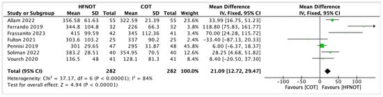 When stratified by surgical type, patients undergoing non-cardiothoracic surgeries showed a significantly greater improvement in PF ratio with HFNOT compared to COT (MD 38.50, 95% CI 26.13–50.88; p < 0.00001), with high heterogeneity (I2 = 83%). However, in the cardiothoracic surgery subgroup, no significant difference was observed between HFNOT and COT (MD 6.37, 95% CI −5.00 to 17.75; p = 0.27) and no heterogeneity was detected (I2 = 0%).