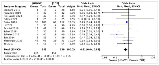 Heterogeneity was low to moderate (χ2 = 15.86, df = 11, p = 0.15; I2 = 31%), supporting the use of a fixed-effects model. The overall effect was statistically significant (Z = 2.96, p = 0.003), indicating a consistent advantage of HFNOT over COT.