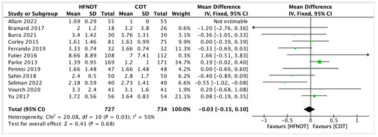 As shown in Figure 5, twelve trials reported on the length of ICU stay in patients receiving HFNOT versus COT. The meta-analysis revealed no significant difference between the two groups (MD = −0.03, 95% CI −0.15–0.10, p = 0.68). Moderate heterogeneity was observed among the studies (I2 = 50%, χ2 = 20.08, p = 0.03).