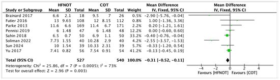 Eight trials reported on hospital length of stay in patients receiving HFNOT (n = 527) versus COT (n = 540). The meta-analysis demonstrated a statistically significant reduction in hospital stay for patients treated with HFNOT (MD—0.31 days, 95% CI −0.52 to −0.11; p = 0.003) (Figure 6).