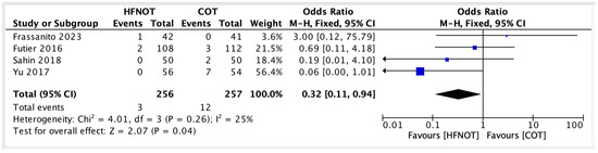Figure 7. Postoperative mortality rates [24,26,30,35].A total of 3 deaths occurred in the HFNOT group compared to 12 deaths in the COT group. Heterogeneity was low (I2 = 25%, χ2 = 4.01; p = 0.26), indicating consistency across studies.