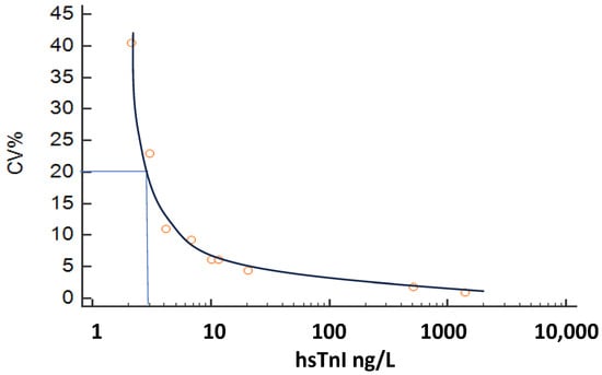 The inter-assay CV of internal quality control materials was 6.2% (@ 10.1 ng/L) and 4.4% (@ 20.6 ng/L). From the inter-assay precision profile, the 10/20% CV corresponded to a concentration of 5.2/3.0 ng/L (see Figure 1). The assay recorded detectable hs-cTnI values more than the limit of detection in 64% of women and 70% of men. In a repeat analysis at another center, CV% was noted to be 32.4/11.7/6.6/5.6/2.4/2.7% (@1.1/2.1/3.3/4.6/5/5/6.6 ng/L), with a 10% CV at 2.46 ng/L and a 20% CV at 1.53 ng/L. It is recommended that hs-cTn assays should not report values below the 20% CV limit of quantitation, and as such, results <3.0 ng/L on this assay would be reported as <3.0 ng/L.