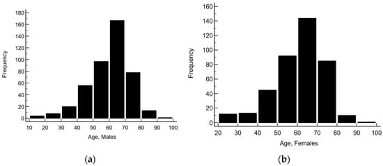 The age of subjects ranged from 18 to 94 years (mean 60.1 ± 12.7 years). Males were from 18 to 94 years (mean 59.7 ± 12.8 years), and females were 20–90 years (mean 60.5 ± 12.6 years) (see Figure 2).