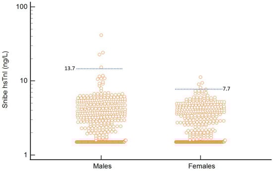 Median hs-cTnI of the study population was 2.9 ng/L (SD 2.6 ng/L) (Kolmogorov–Smirnov test D = 0.24, normality of distribution rejected). For females, the hs-TnI values were significantly lower than males (median: females vs. males 2.6 vs. 3.2 ng/L, Mann–Whitney p = 0.005) (see Figure 3). The derived 99% URL for the population was 7.7 ng/L (90% CI 6.93–22.8 ng/L) for women and 13.7 ng/L (90% CI 10.6–41.4 ng/L) for men. When we restricted analysis to only subjects ≥40 years old, males had a 99% URL of 14.8 ng/L (n = 412, 90% CI 10.6–41.4 ng/L) and females had a 99% URL of 8.1 ng/L (n = 377, 90% CI 6.95–22.8 ng/L).