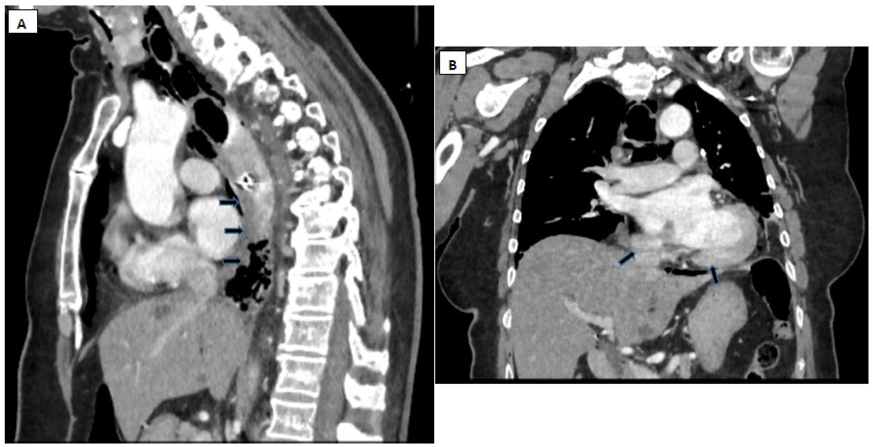 - Ariza-Traslaviña, J.; Caballero-Otálora, N.; Polanía-Sandoval, C.A.; Perez-Rivera, C.J.; Tellez, L.J.; Mosquera, M. Two-staged surgical management for complicated Boerhaave syndrome with esophagectomy and deferred gastroplasty: A case report. Int. J. Surg. Case Rep. 2023, 103, 107881. [Google Scholar] [CrossRef] [PubMed] [PubMed Central]