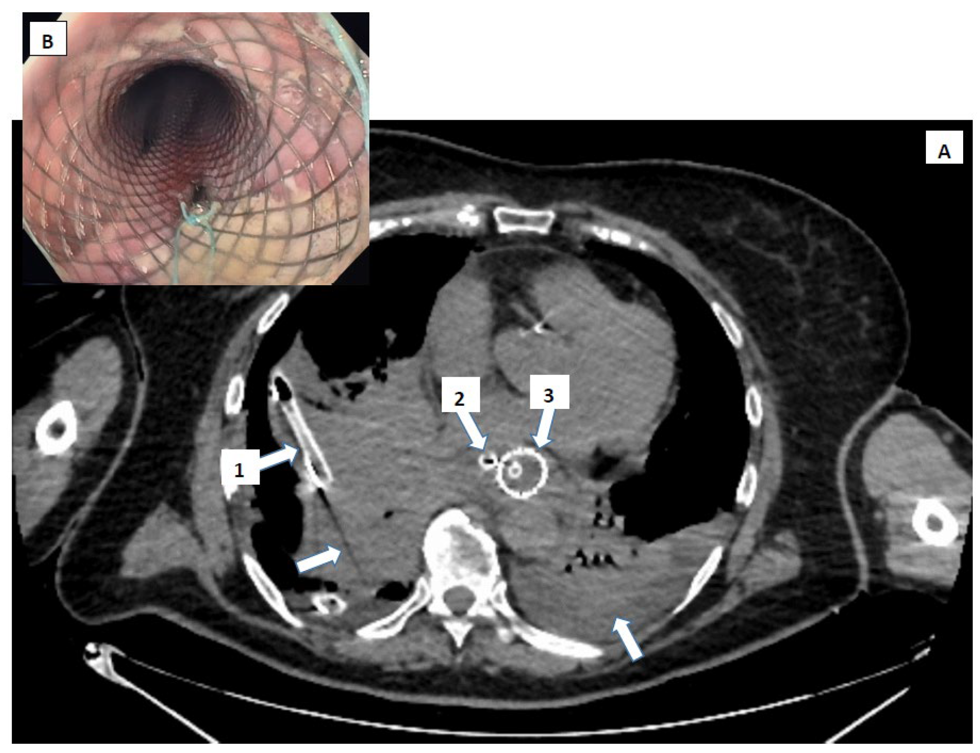 - Kopelman, Y.; Abu Baker, F.; Troiza, A.; Hebron, D. Boerhaave syndrome in an elderly man successfully treated with 3-month indwelling esophageal stent. Radiol. Case Rep. 2018, 13, 1084–1086. [Google Scholar] [CrossRef]